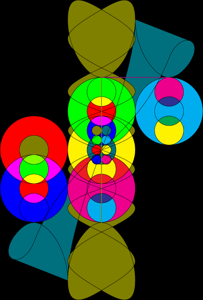 The inventor of Body Electronics, the late Dr. John Whitman Ray, said, to the assembly at a seminar he gave in 1982, that I and my collaborator at that time knew, based on information represented by a diagram I had composed (its most recent graphic representation appears in both of the pictures on this page), “more than anyone else about what we are doing.” I call this diagram dharma-murti. The term is in the language Sanskrit, and may be translated as essence form, essence pattern, or essential organization. I conceive of dharma-murti as our entire being’s essential organization, revealing the color codings for, and interactive overlaps among, the core features (dormant or awake) of each living being. [More text appears below the following picture.]